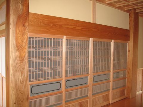 ホール奥の天井はあじろ天井。